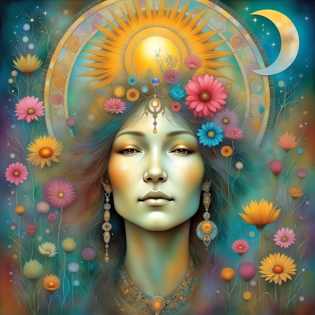 This image captures the essence of a romantic encounter in a whirlwind of vibrant colors and intricate details, featuring a sun and moon in ornate halos, set against a geometric background.