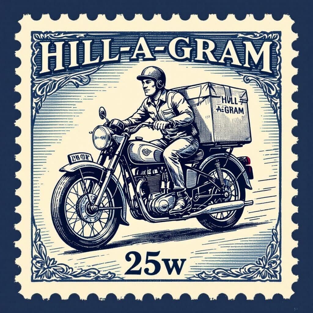 This image shows a vintage-style blue postage stamp with a dynamic deliveryman on a motorcycle. It features the text "HILL-A-GRAM" and "25w" in engraved linework style.