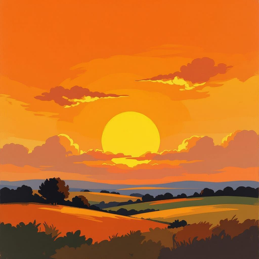 A radiant sunset featuring a warm, orange sky and soft clouds. The image evokes the style of abstract expressionism using bold color fields and dreamy landscape elements.