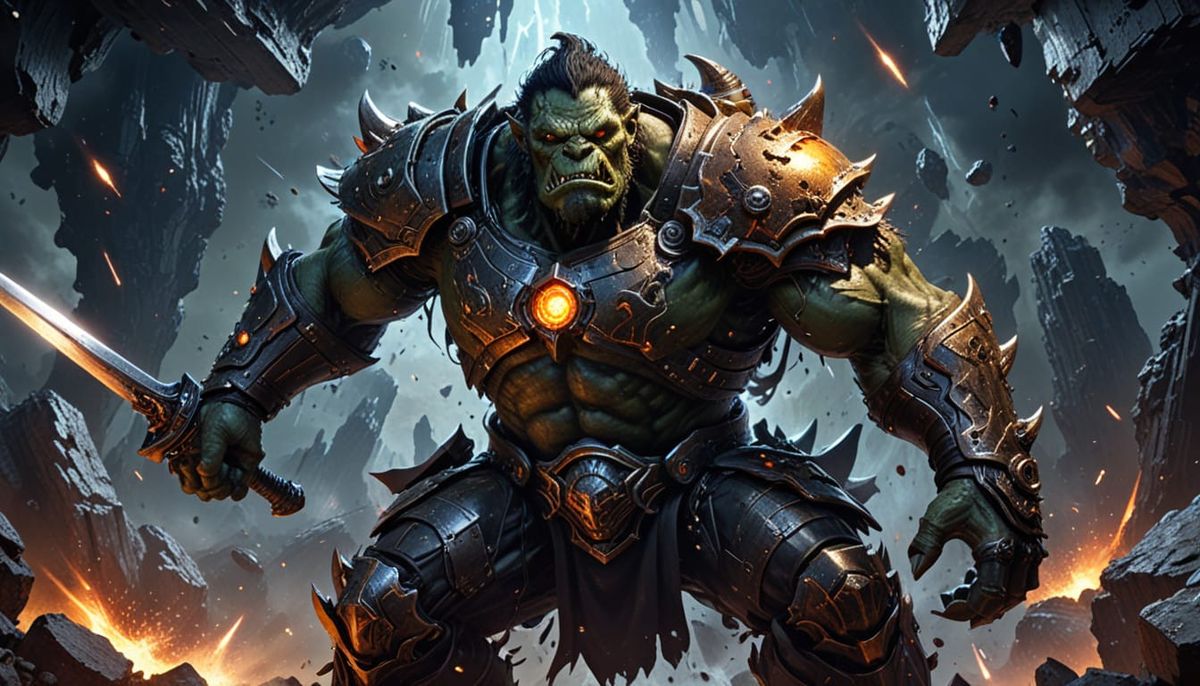 A towering Orc warrior, clad in metallic armor, stands strong amidst a swirling vortex of stars and planets, its piercing gaze meeting the viewer's as it holds crystal-tipped swords. Dramatic lighting and neon explosions create a charged, otherworldly atmosphere, blending gritty manga intensity with sci-...