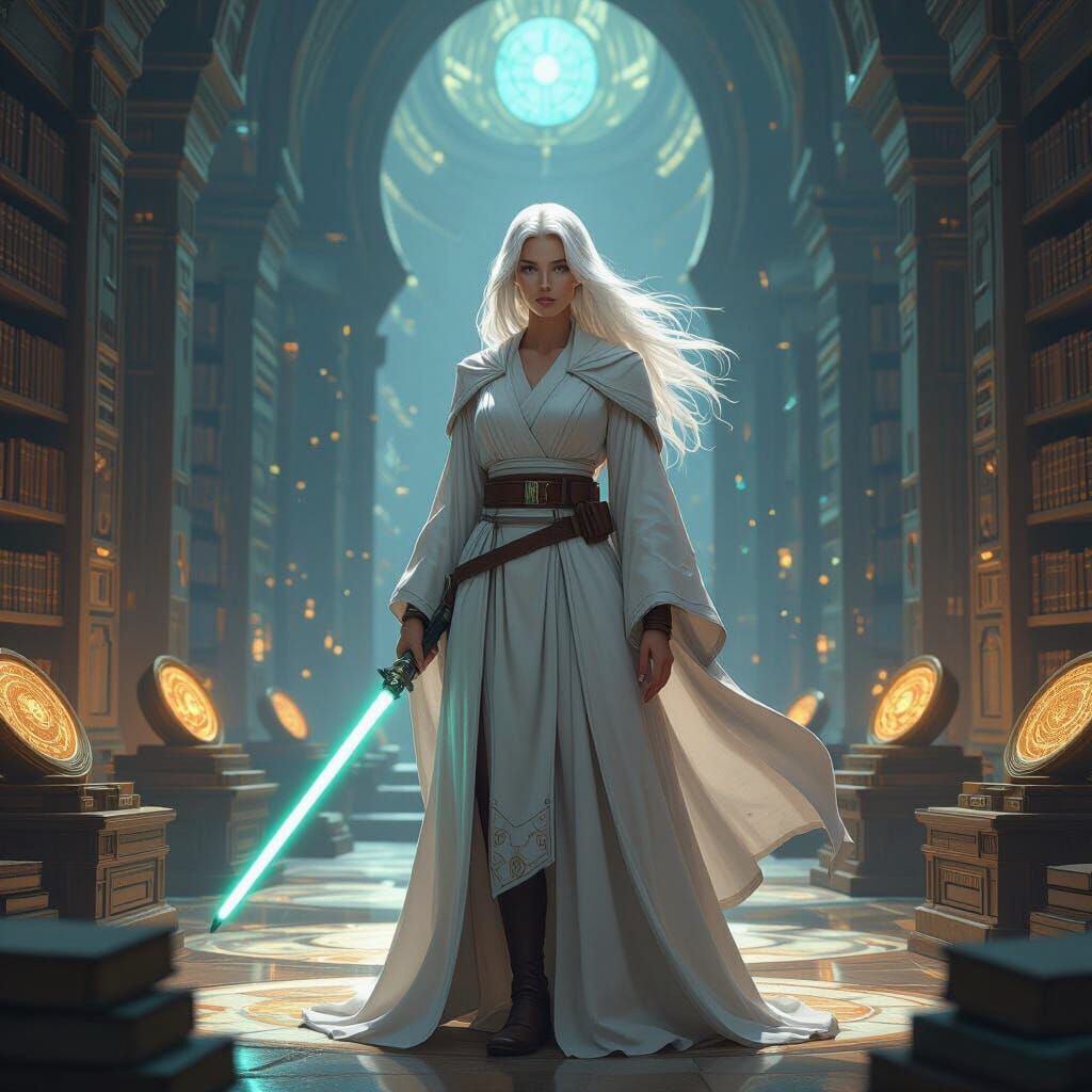 This image shows a Jedi Knight with white hair in a serene pose. The character is surrounded by glowing holocrons within an ancient temple in a digital art style.