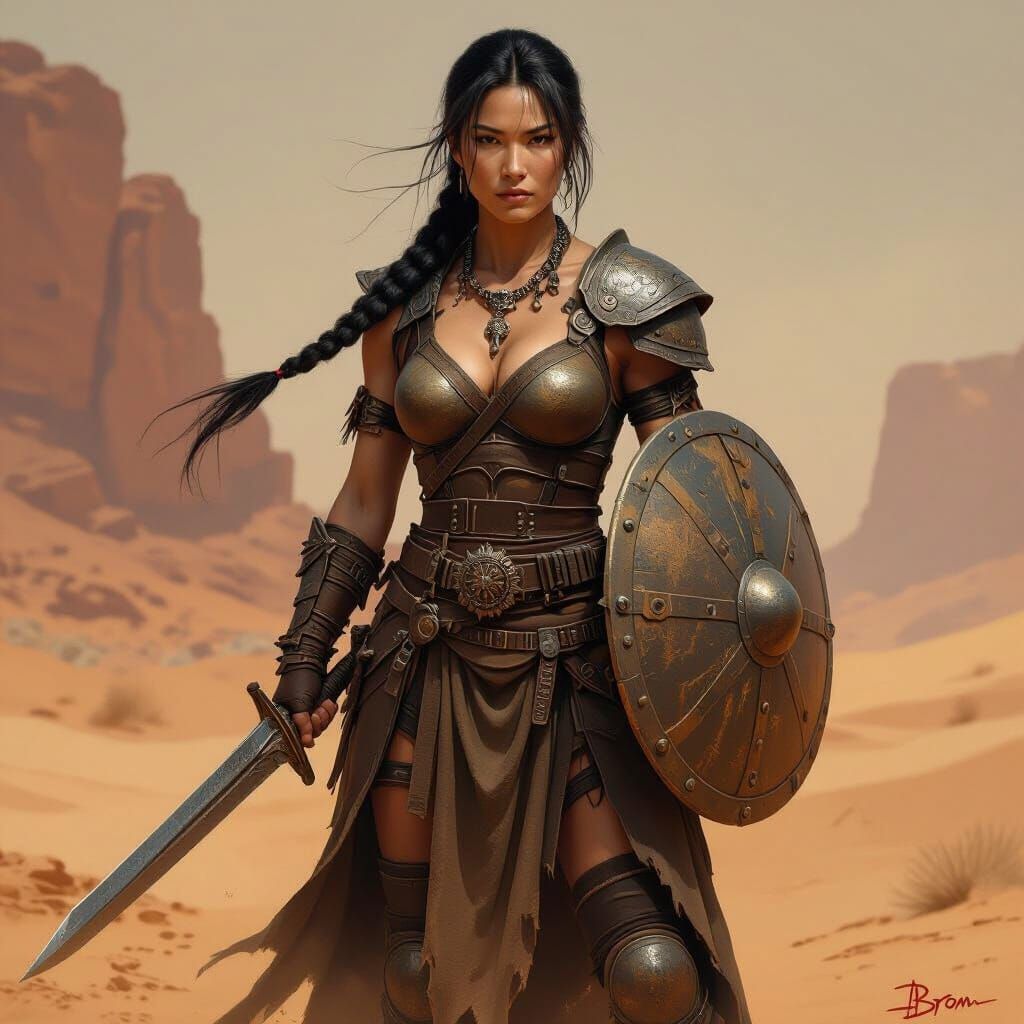 A middle-aged Asian warrior woman in weathered leather armor stands in a vast desert. She grips a shield and sword, her expression stern and resolute. Rendered in a gritty, realistic concept art style.
