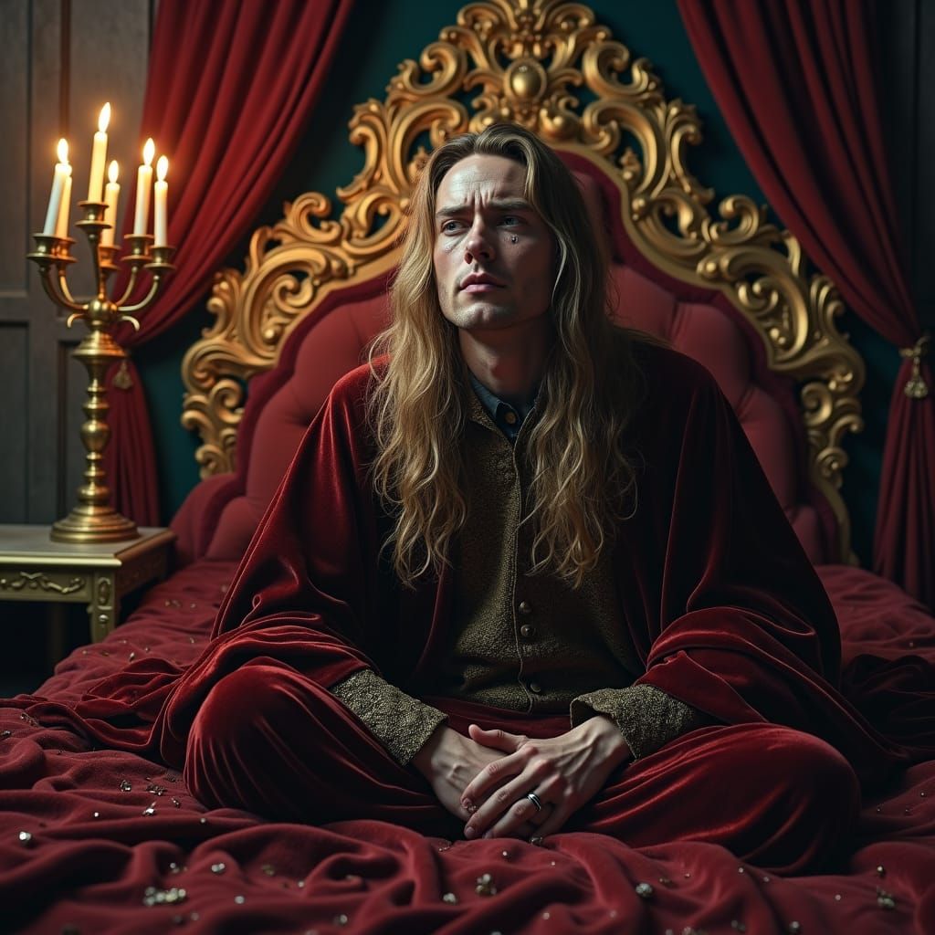 A sorrowful king sits on a bed in a dimly lit chamber, tears streaming down his face. The baroque scene evokes high-fantasy and dark academia aesthetics with photorealistic rendering.