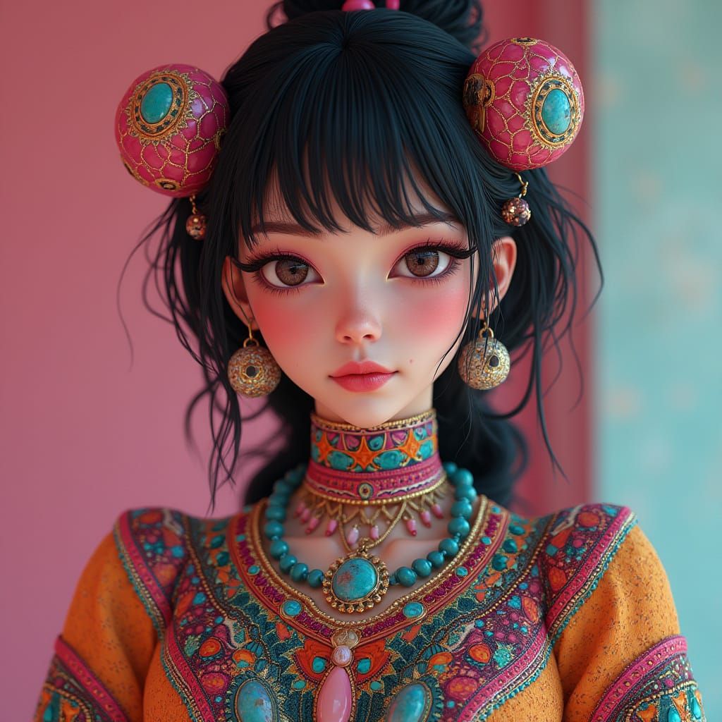 A hyperrealistic portrait of a woman adorned with colorful clothing and futuristic jewelry, set against a complementary background. The image has a matte painting and 3D rendered digital art style.