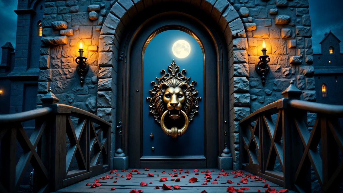 This image showcases a magnificent ornate castle entrance with a brass lion doorknocker. A dramatic night scene unfolds with moonlight and torchlight illuminating the gothic architecture.