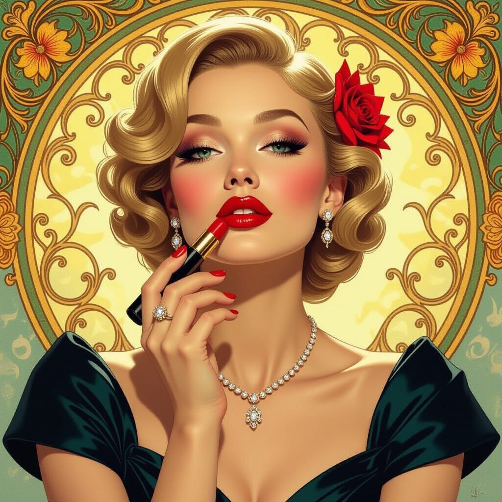 A close-up of a blonde woman applying red lipstick. The image has soft, golden lighting and intricate details in a stylized realism, with influences of romanticism and vivid colors.