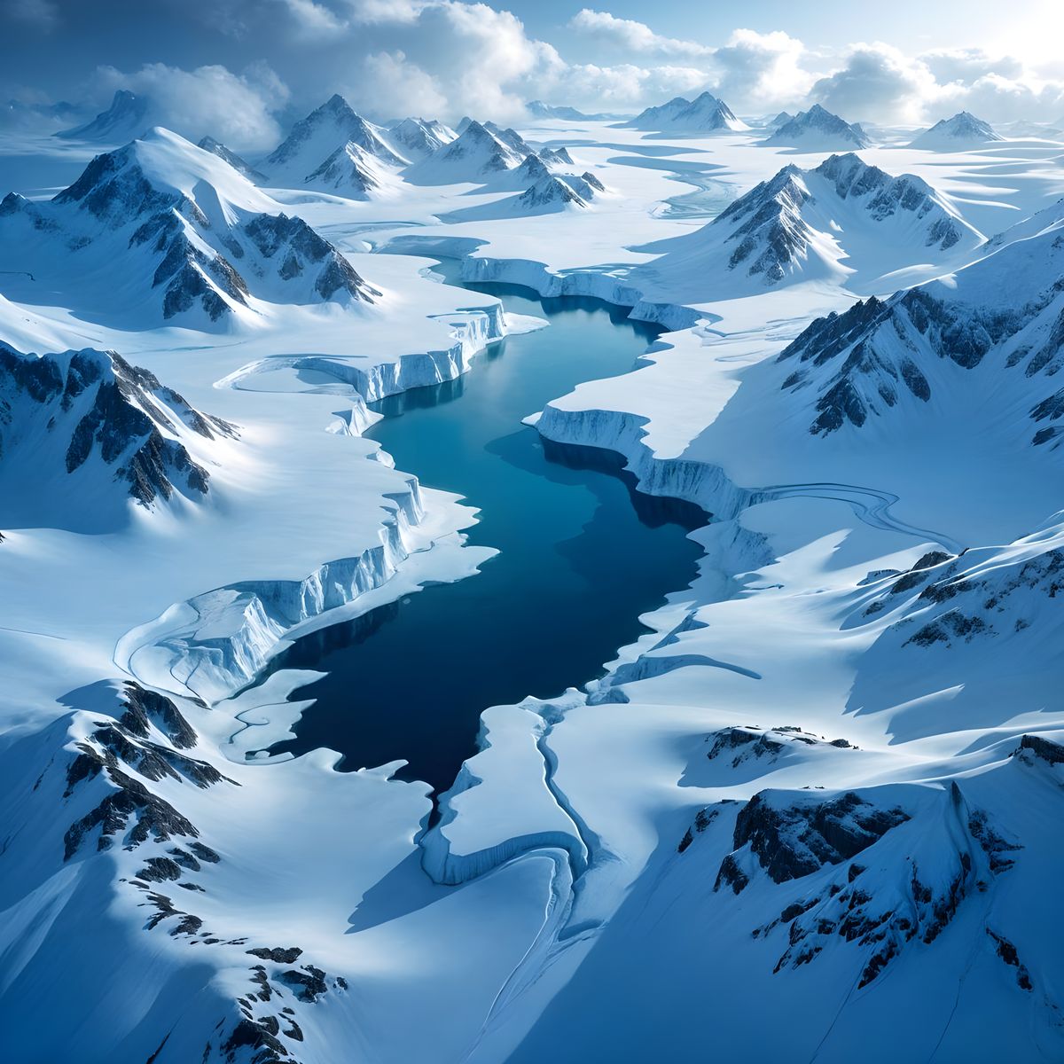 A stunning aerial view of a sprawling, frozen landscape featuring sharp mountain peaks and winding glaciers. The hyperrealistic image captures the desolate beauty of the Arctic wilderness with dramatic lighting.