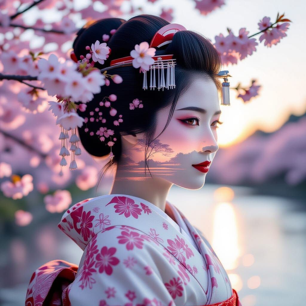 This image features a photorealistic double exposure of a geisha silhouette filled with a Japanese cherry-blossom landscape at sunrise. It uses a soft pastel palette and cinematic lighting.