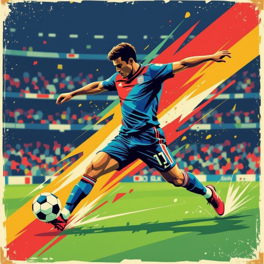 A dynamic sports poster featuring a stylized, abstract representation of a soccer player mid-kick, using bold, geometric shapes and vibrant, contrasting colors. The background is a blur of motion, suggesting speed and energy. The overall aesthetic is inspired by vintage travel posters and modern graphic ...