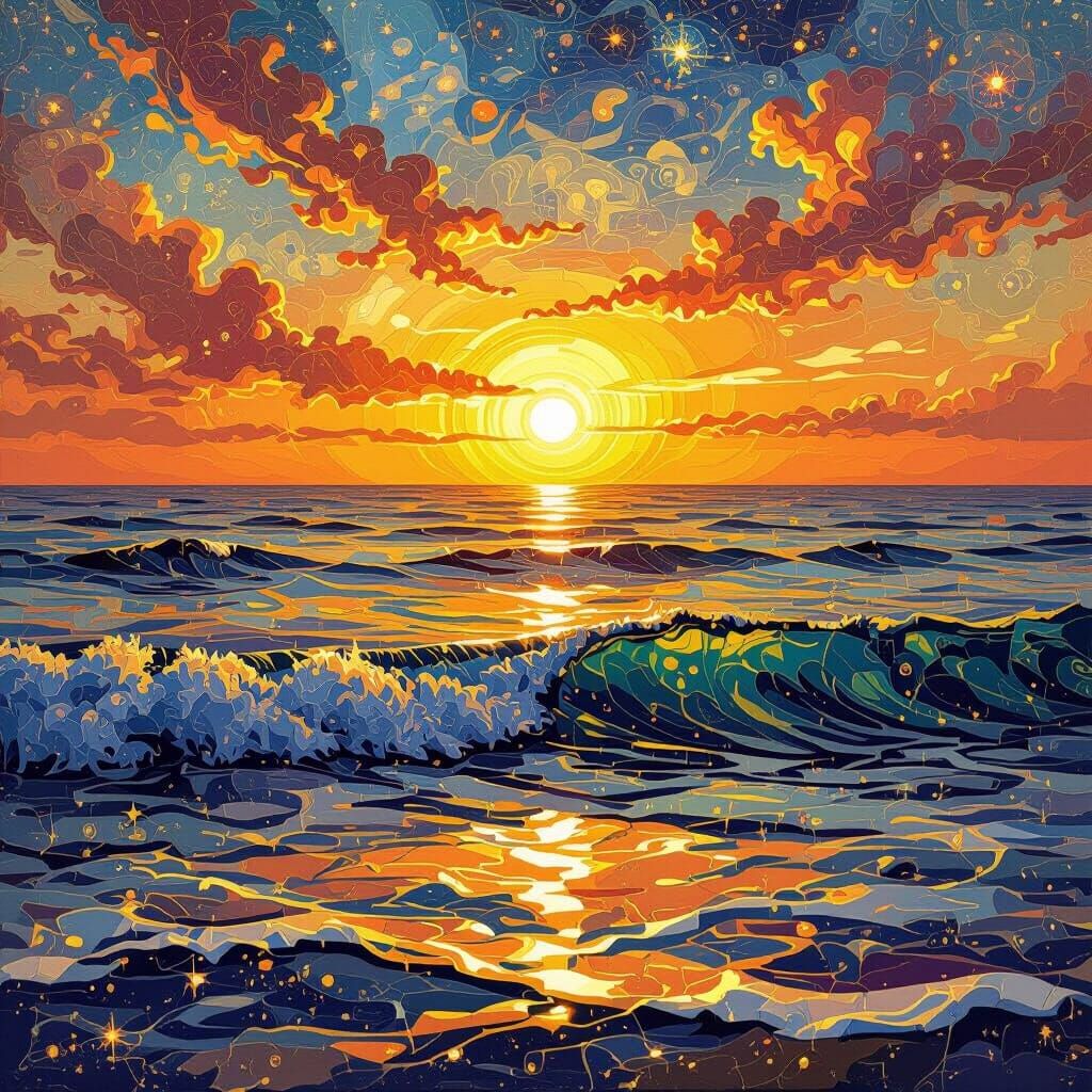 A vibrant sunrise over the ocean, with golden light reflecting on the waves. The image evokes post-impressionist painting with cosmic visionary art and holographic details.