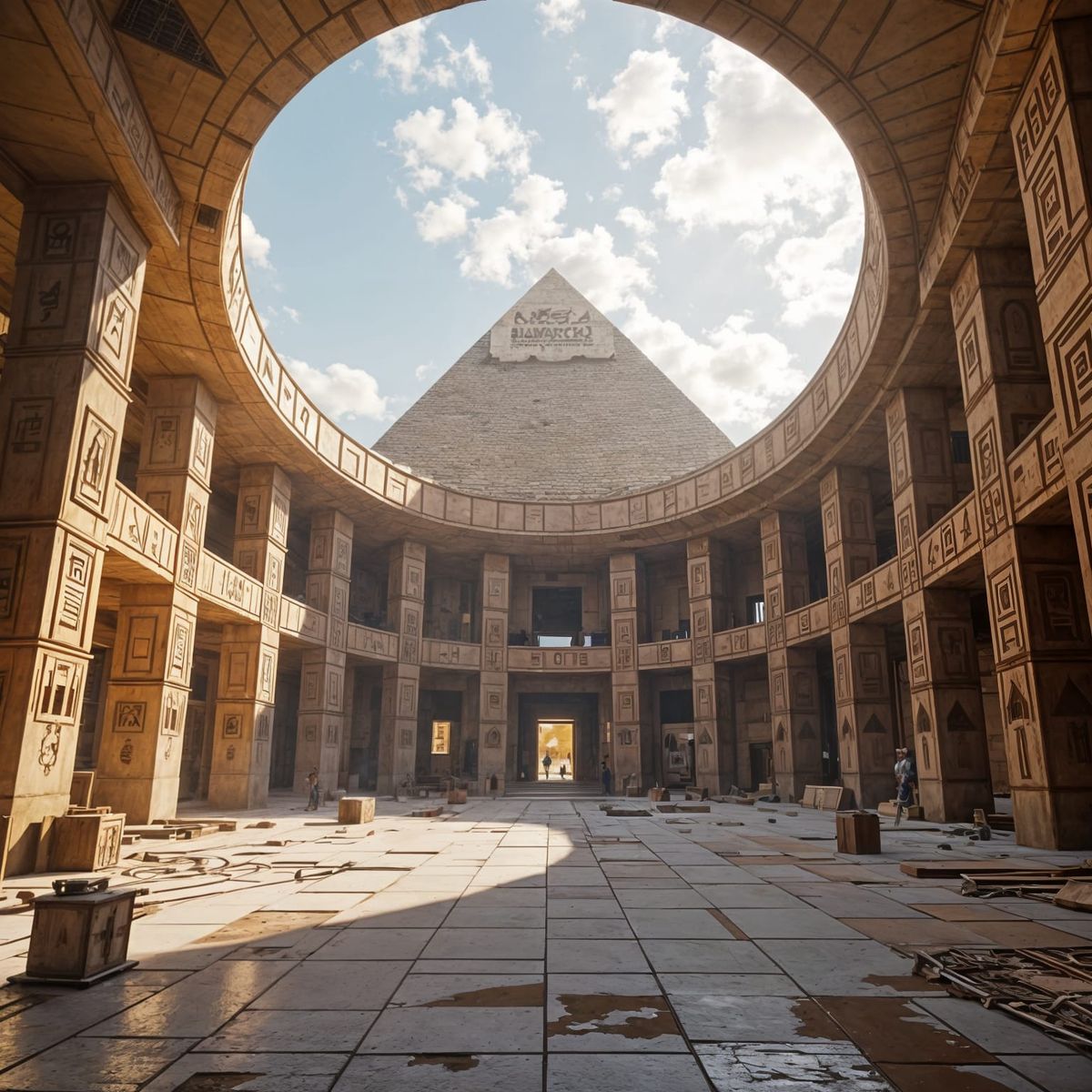 A hyperrealistic, GoPro-style interior view of the Pyramids of Giza. Cinematic lighting and detailed textures evoke a photorealistic aesthetic reminiscent of science fiction art.