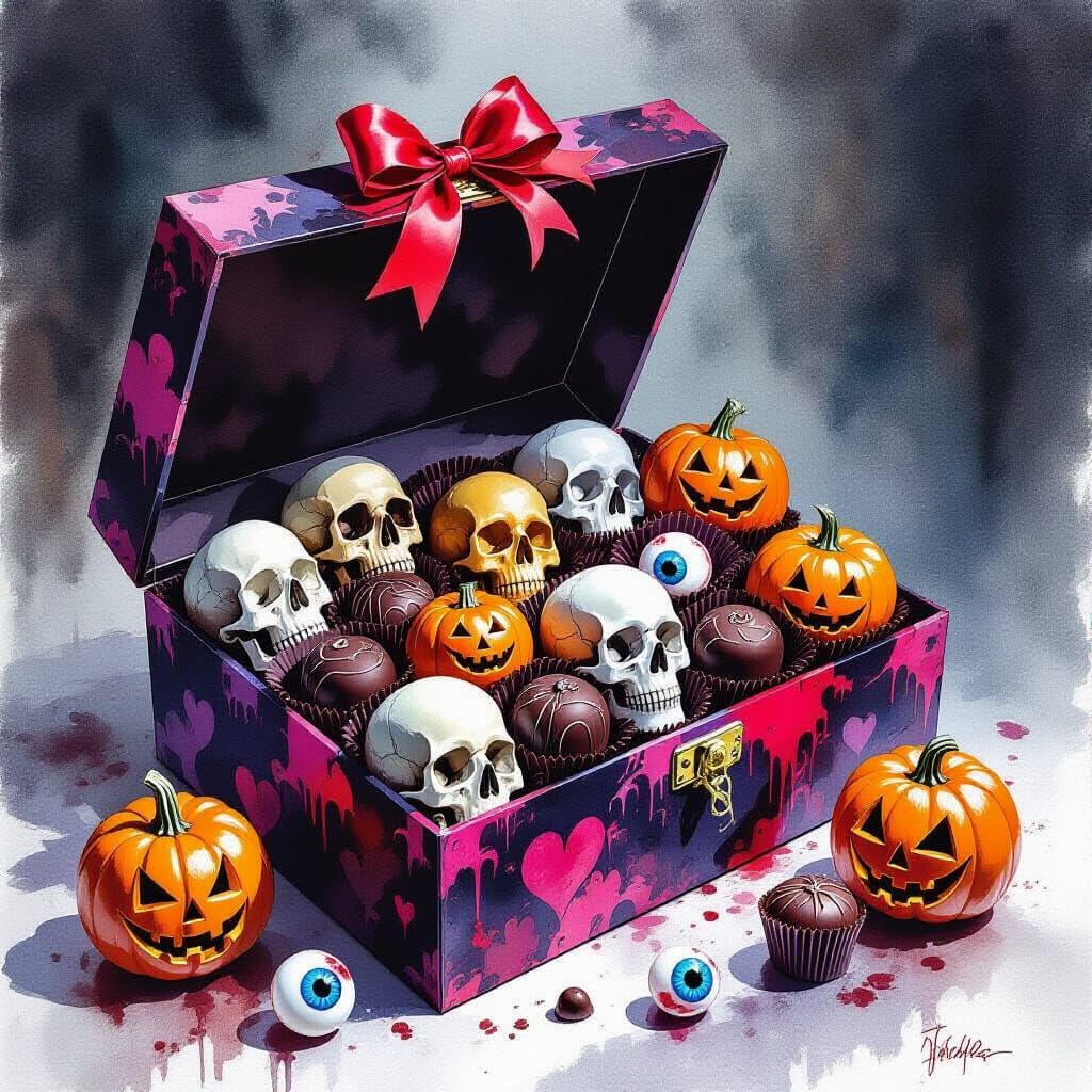 This image showcases a haunted gothic Valentine's box filled with skulls, pumpkins, and eyeballs. Rendered in a vibrant watercolor splash art style with visible brushstrokes and dynamic lighting.