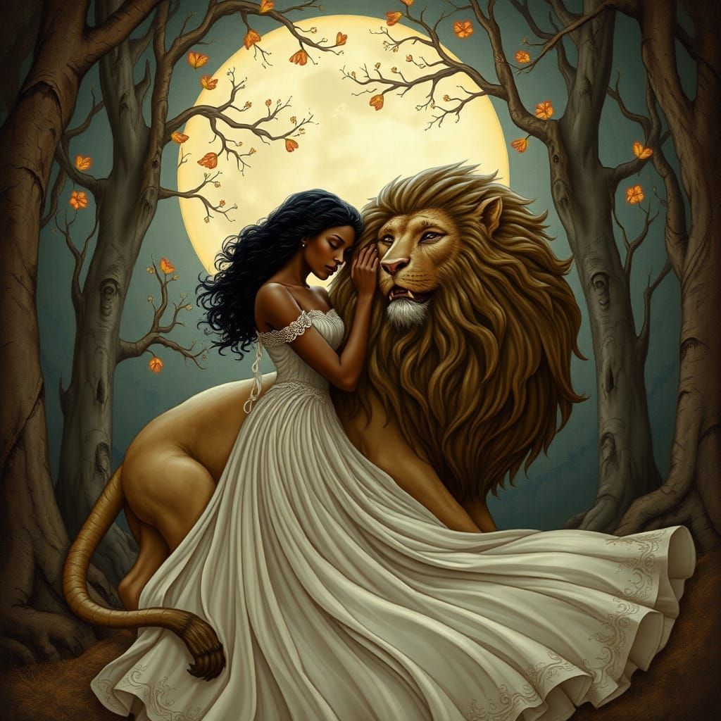 This image shows a Black woman in an elegant gown embracing a lion-like creature in a moonlit forest. The artwork evokes the style of Art Nouveau illustrations.