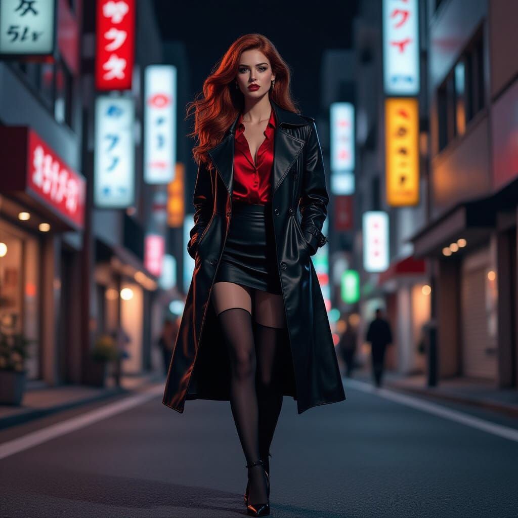This image shows a woman with auburn hair in a Tokyo street at night. She wears a trench coat, blouse, stockings and heels, all illuminated by neon in photorealistic style.
