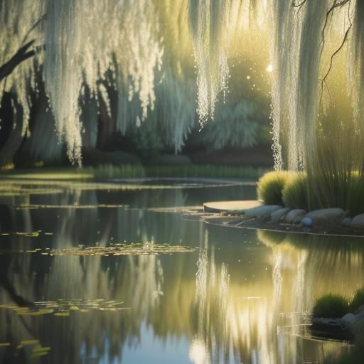 A serene image of a person kneeling by a pond, hands gently touching the water under a weeping willow. Soft focus and dappled light create an ethereal, dreamy atmosphere.