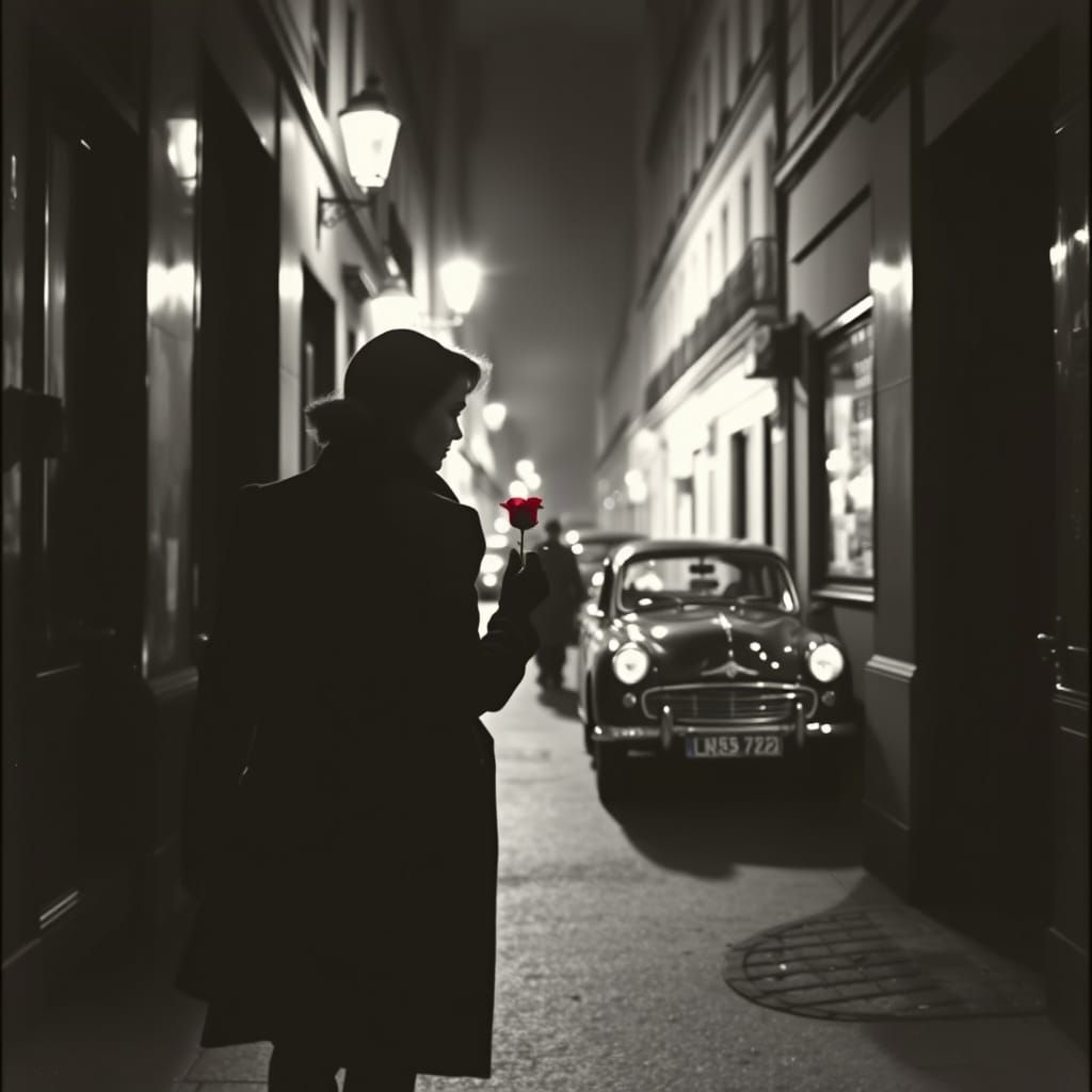 This image depicts a shadowy Parisian alleyway at night, featuring a vintage Citroën and a woman in a trench coat holding a rose. It evokes a classic detective film aesthetic with a grainy, black and white style.