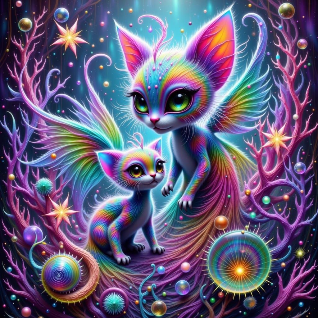 This enchanting image features iridescent, metallic fishies amidst a kaleidoscopic, transparent glass coral reef, radiating a soft, ethereal glow, evoking the dreamlike quality of abstract expressionism and the intricate patterns of organic art.