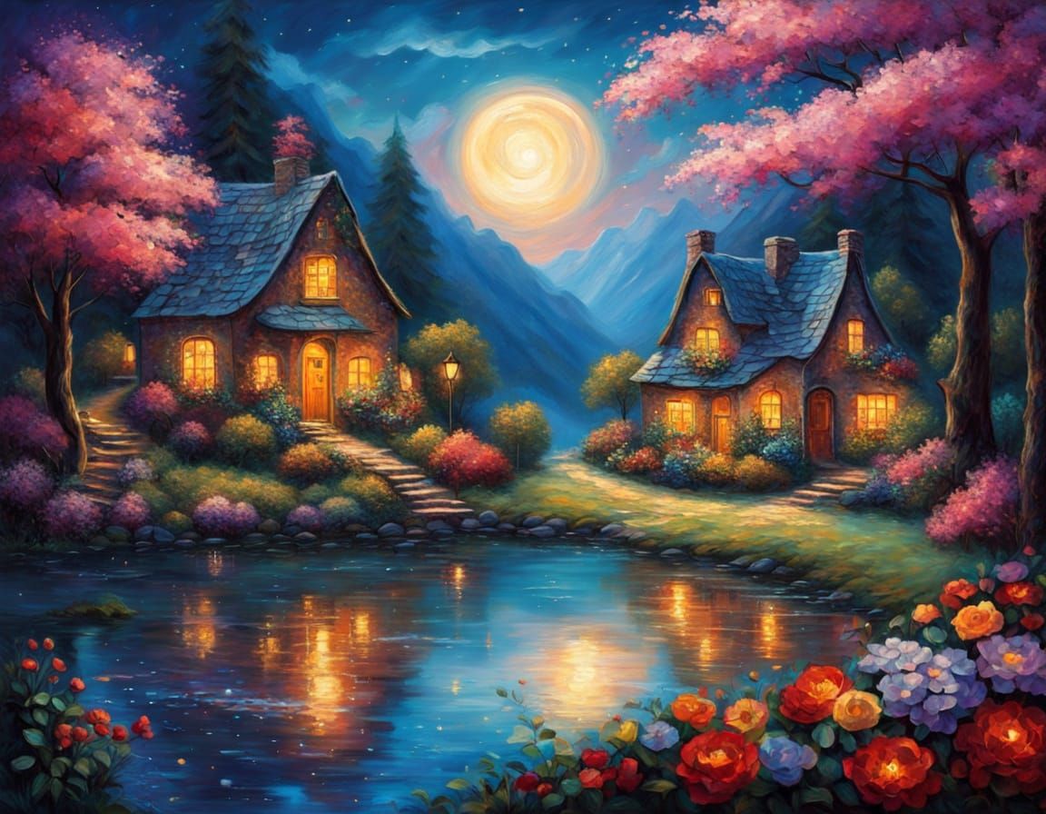 This image showcases a cozy cottage by a lake, surrounded by vibrant flowers. Painted in an impasto oil style with thick brushstrokes, it features a dreamlike atmosphere and magical lighting.