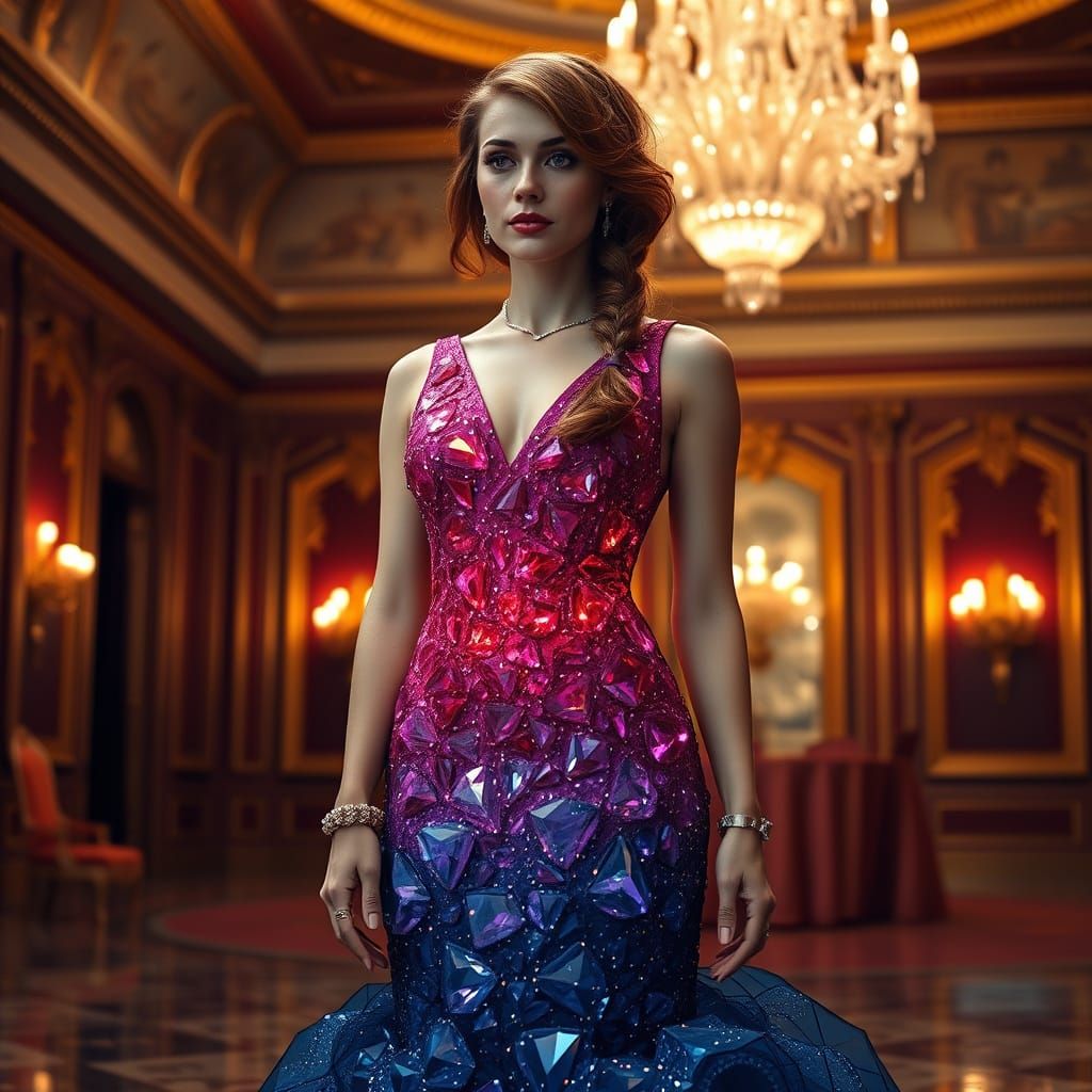 This image captures a woman in a stunning, crystal-encrusted mermaid dress, set against the opulent backdrop of a grand ballroom, with a cinematic, high-contrast glow that highlights the intricate details of her crystalline form and the ornate surroundings.