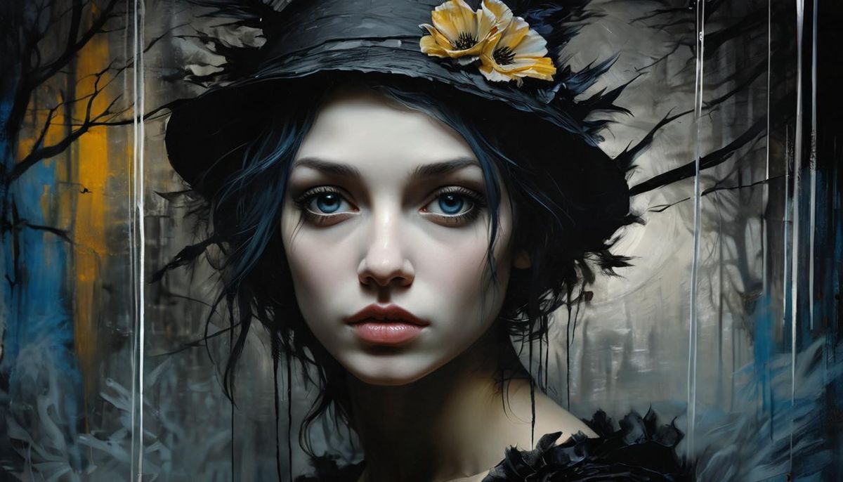 A monochromatic image of a forlorn demonic princess in a moonless night. The picture evokes a sense of sorrow and love, rendered with intricate detail in a neo-expressionist style.