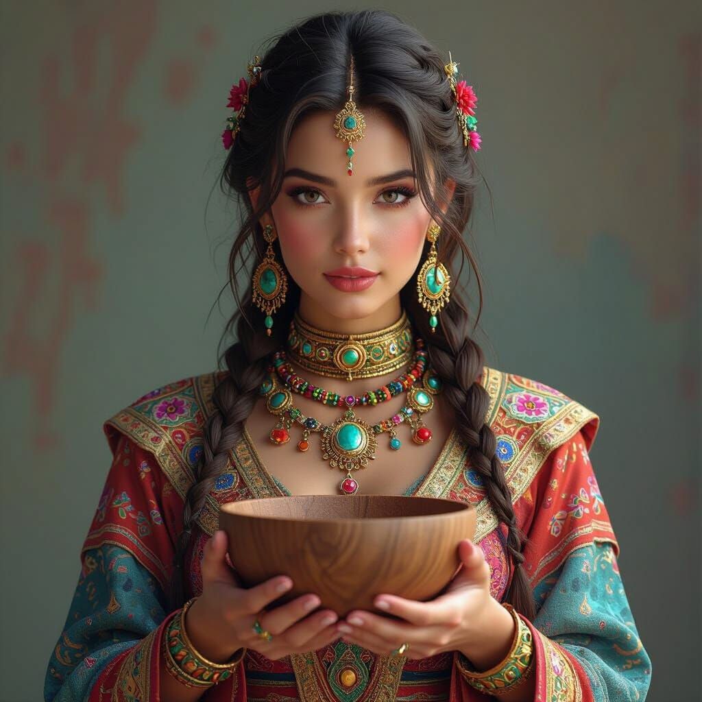 A hyperrealistic image of a woman with colorful clothing and jewelry holding a wooden bowl. The artwork has a matte painting aesthetic with vibrant colors and intricate textures, in a fantasy concept art style.