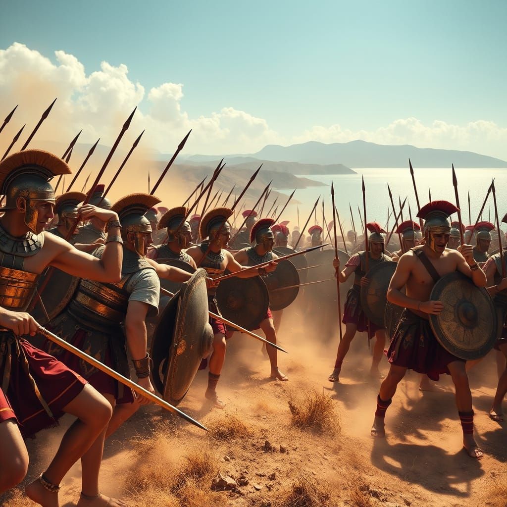 This image depicts a dramatic battle scene between ancient Greek hoplites and Persian warriors on the sun-scorched plains of Marathon, with the distant Aegean Sea and rolling hills in the background, showcasing the intensity and chaos of ancient warfare in vivid colors and textures reminiscent of histori...