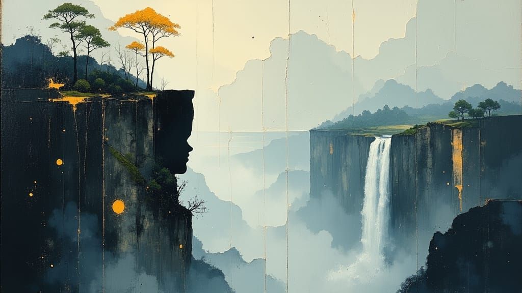 This image features a breathtaking waterfall cascading down a cliff face, shrouded in mist and clouds, with lush trees surrounding the scene.