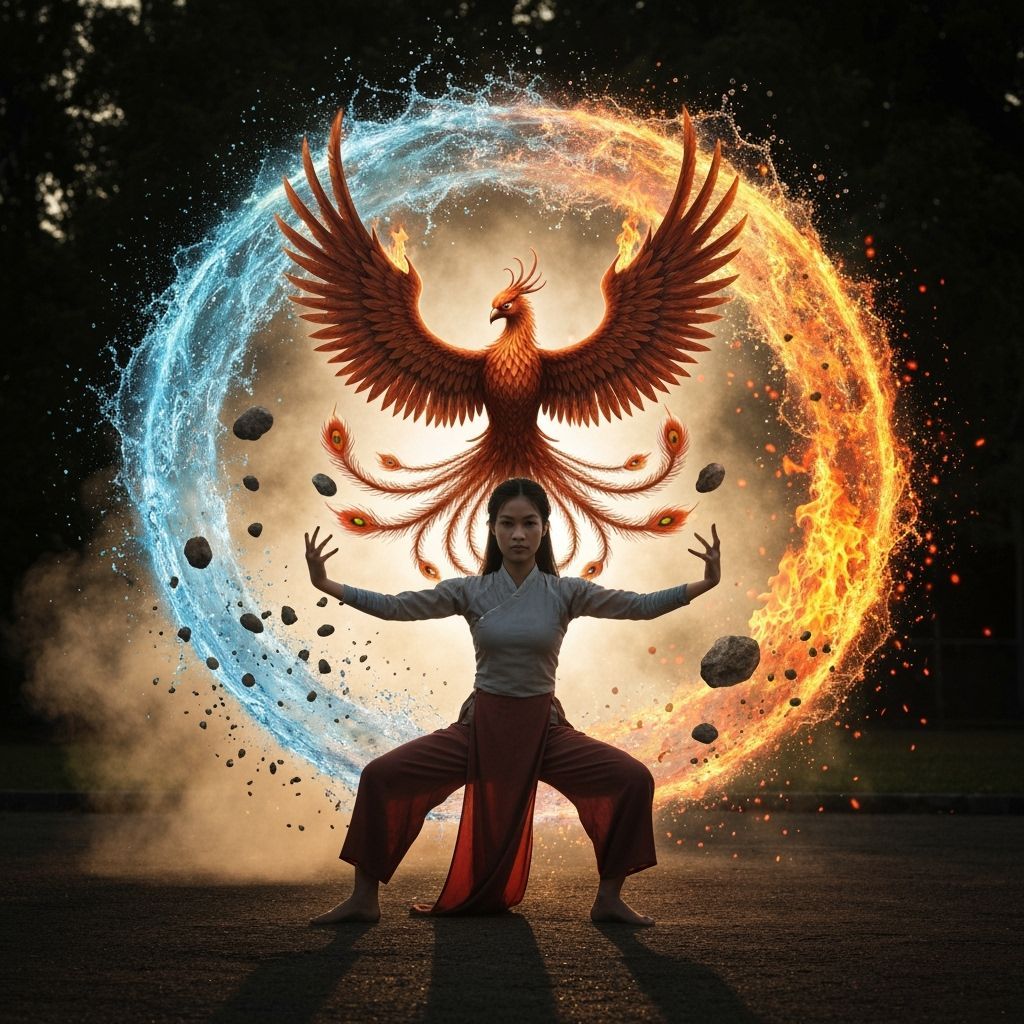 This realistic photograph shows a Vietnamese woman performing an elemental bending stance. A phoenix made of fire and swirling elements emerges dynamically from her hands.