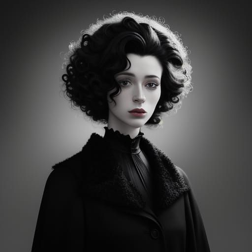 This image shows a striking monochromatic photograph of a woman with a unique hairstyle. The portrait uses high contrast, soft focus, and dramatic shadows to create a sophisticated film noir style.