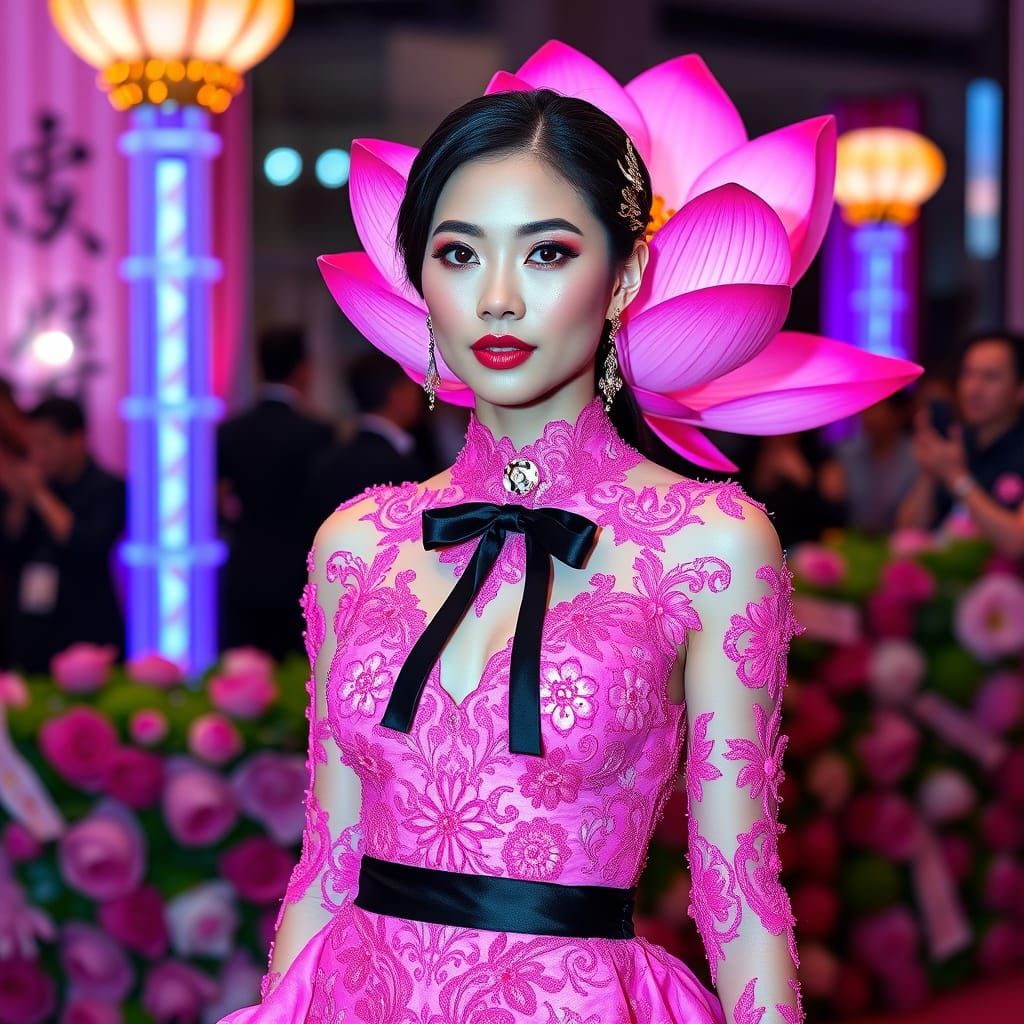 This image shows a stunning, futuristic evening gown featuring intricate lace, floral patterns, and sequins, inspired by fantasy concept art and surrealism, with a mix of neon and whimsical elegance