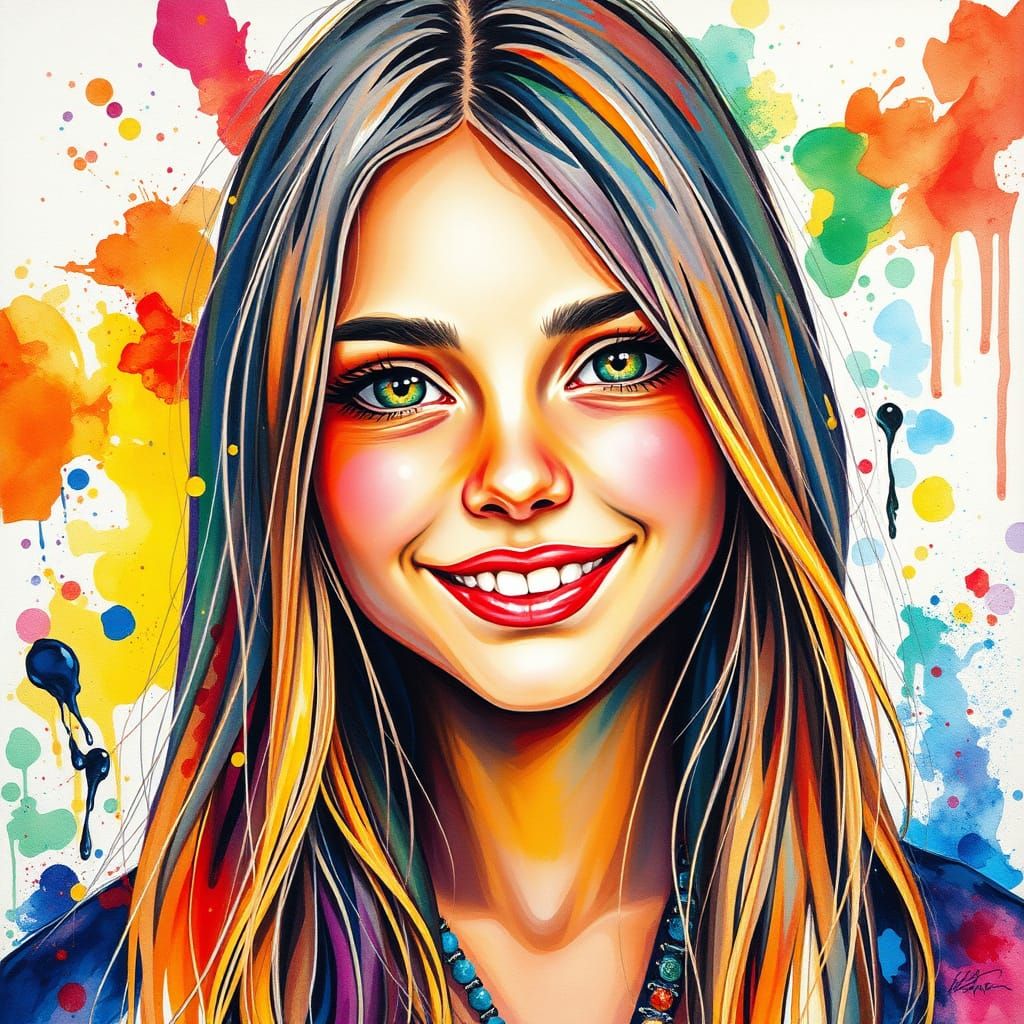 A vibrant image of a happy hippie girl with straight hair making eye contact. The artwork features melting paint and a colorful, splash art aesthetic.