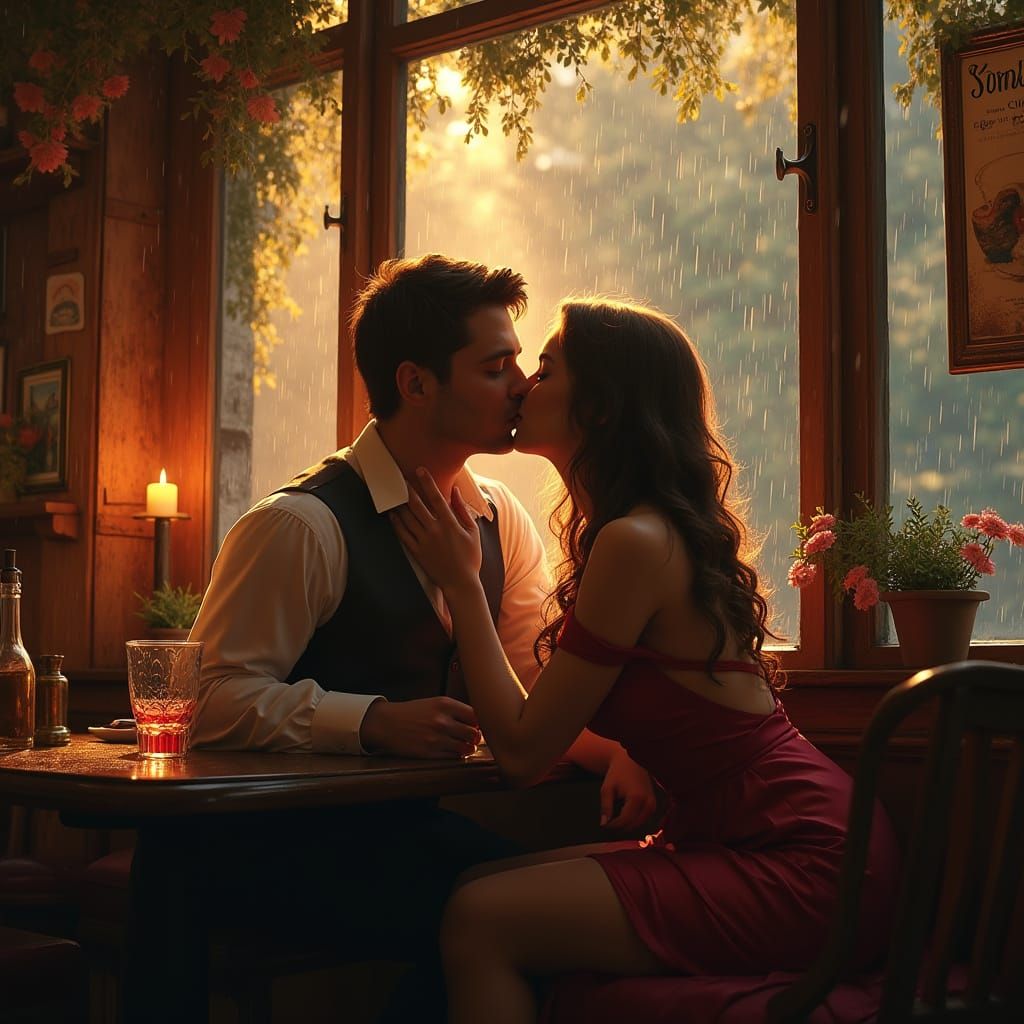 This image shows a couple kissing in a cozy French bistro on a rainy evening. The scene is rendered as detailed matte painting with rich colors and fantastical details, evoking a dreamlike, romantic mood.