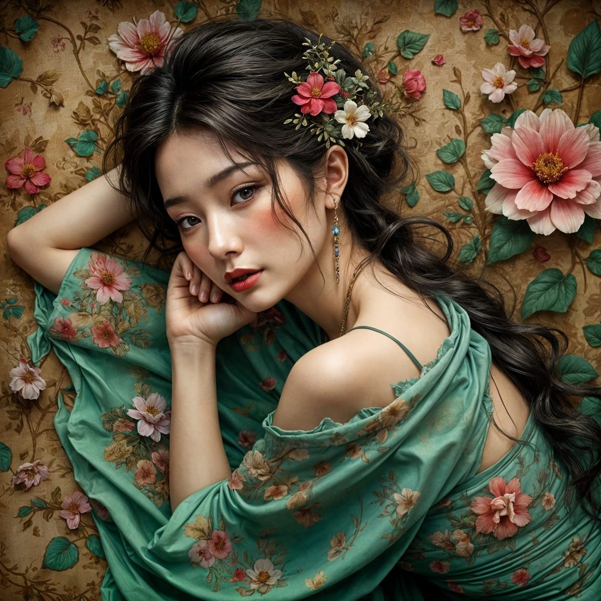 This image is a highly detailed concept art portrait of a Chinese woman in a contemplative pose, showcasing dynamic lighting and intricate details in a vibrant color palette reminiscent of Alphonse Mucha's style.