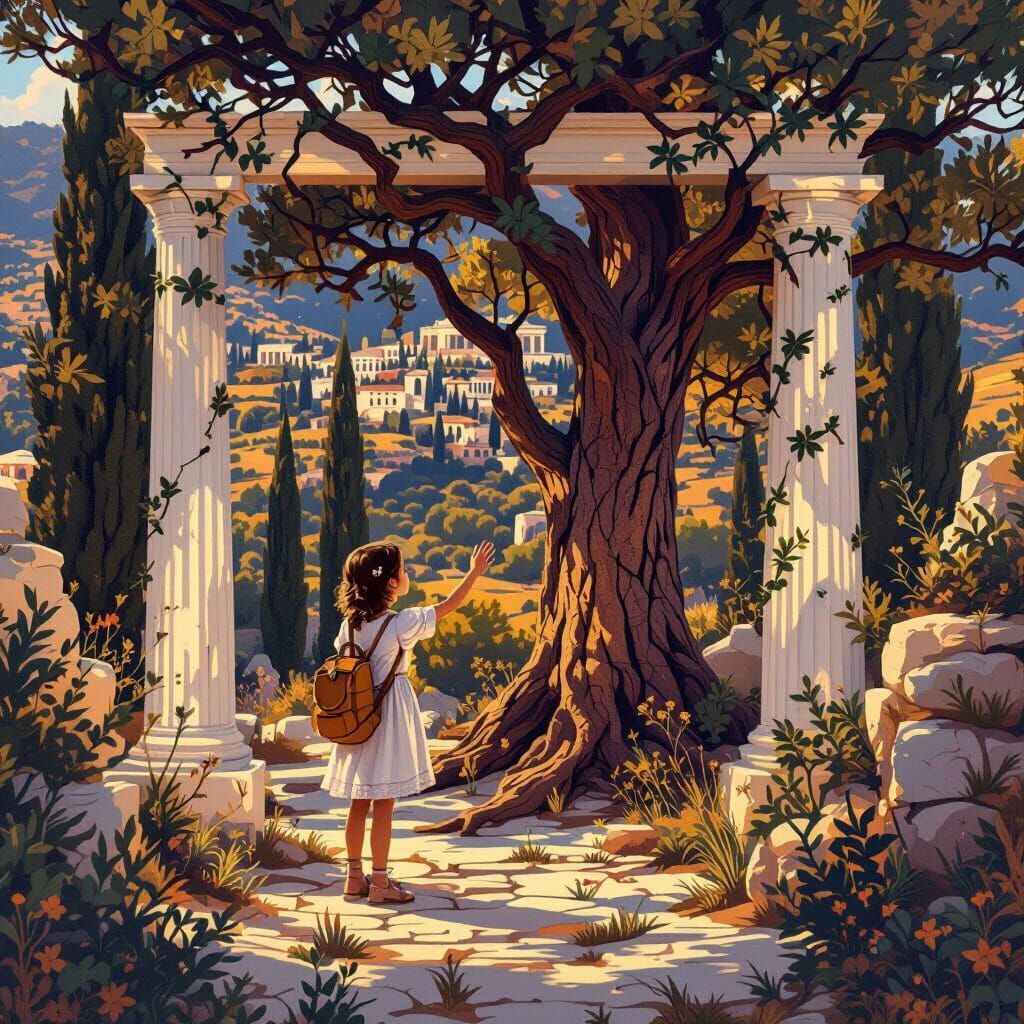 A young girl named Dasha marvels at a sun-drenched Ancient Greek landscape. This vibrant, detailed illustration features rolling hills, cypress trees, and marble columns in a magical, fantasy style with cinematic lighting.