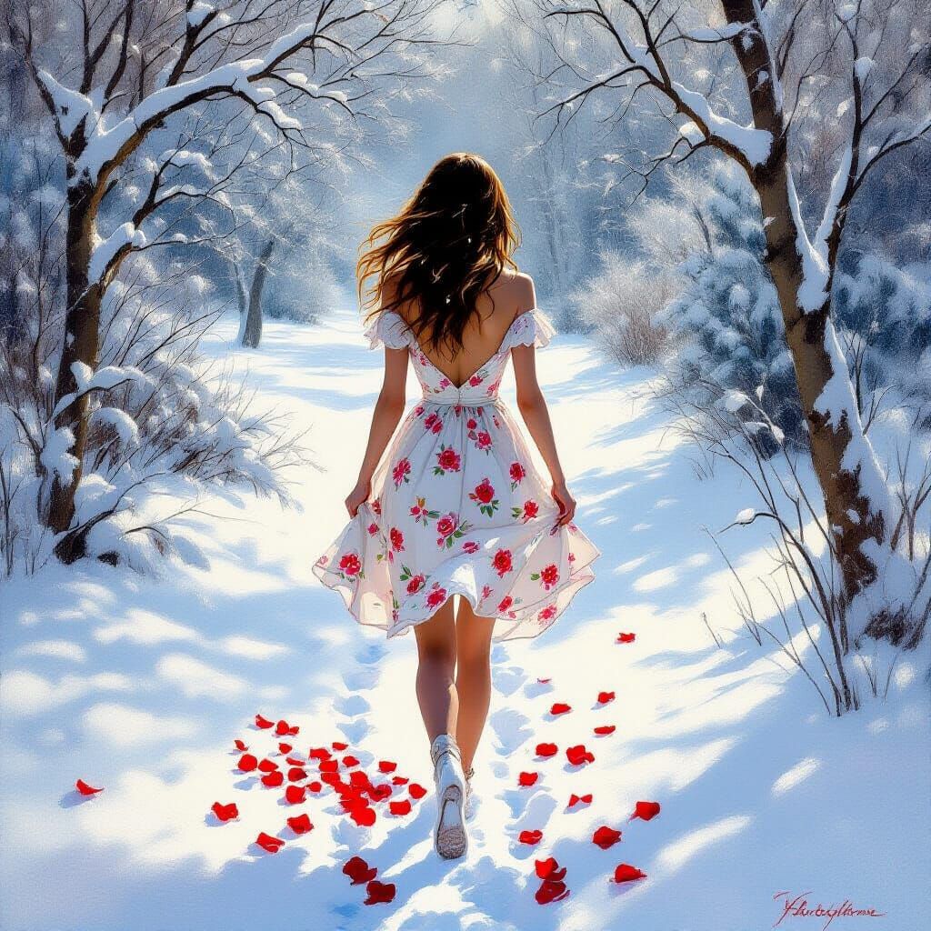 A woman in a short floral dress walks through snow scattered with rose petals. This scene is depicted in an ethereal oil painting style with visible brushstrokes and a dreamlike atmosphere.