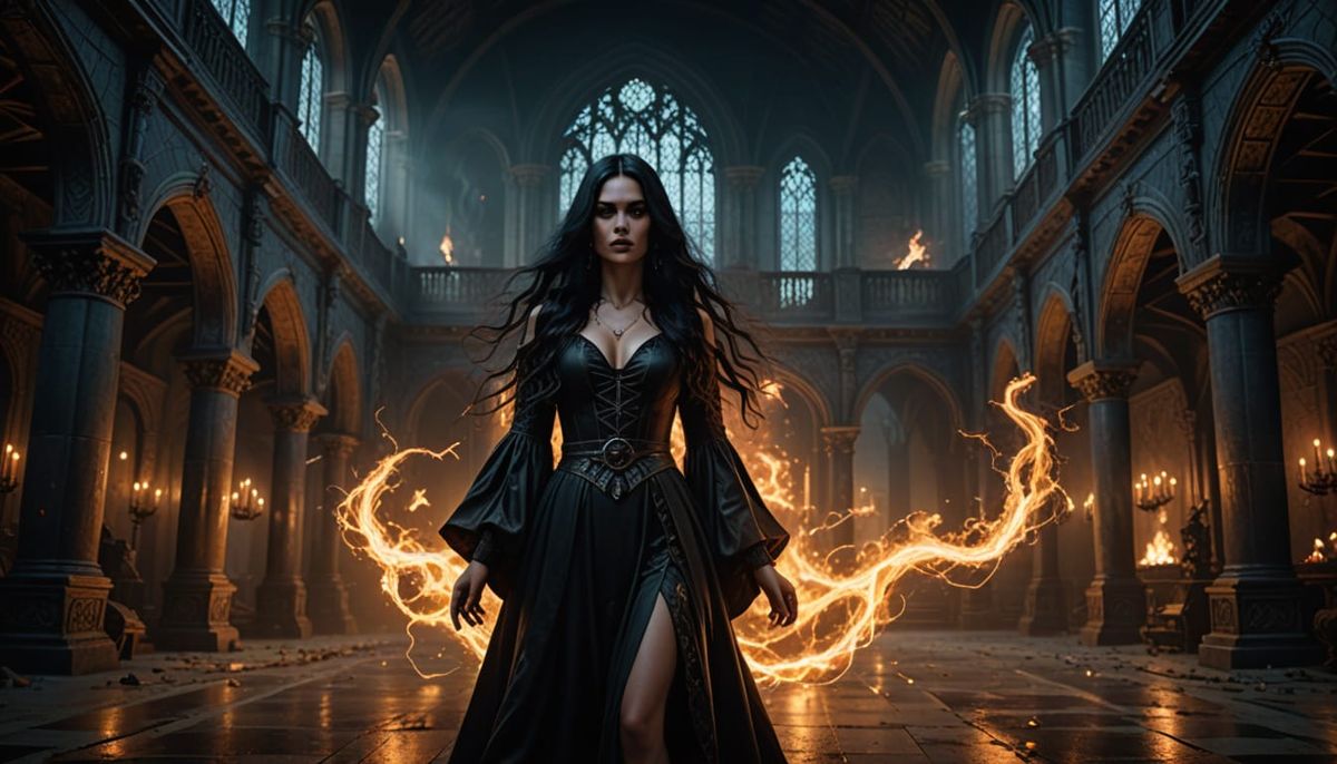 A 22-year-old Dominican woman with long black hair and gray eyes depicted as a Dark Witch of Chaos. She stands in a magical palace with fire and lightning surrounding her, rendered in detailed dark fantasy art.