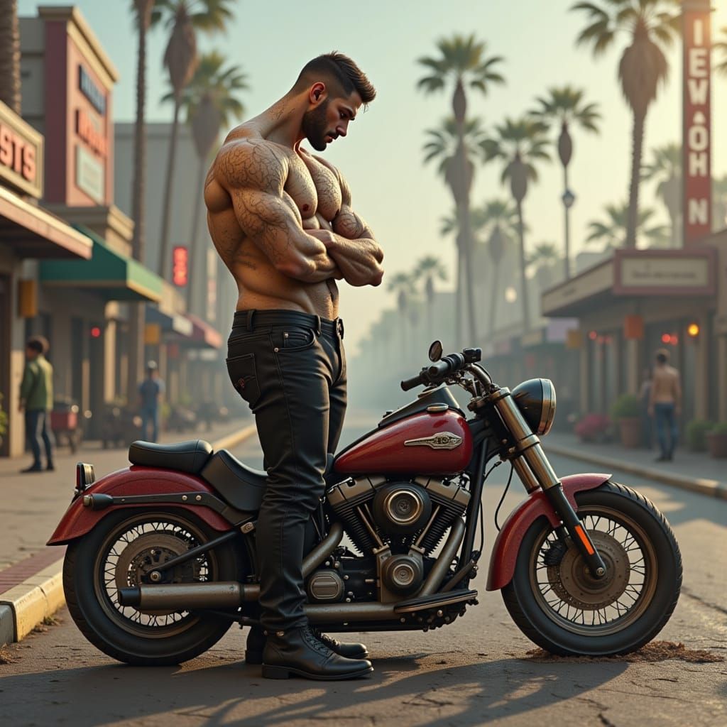 A photorealistic image of a muscular, stoic golem male figure with cracked, clay-like skin, standing proudly on the Vegas strip with his Harley Davidson. Cinematic concept art style.