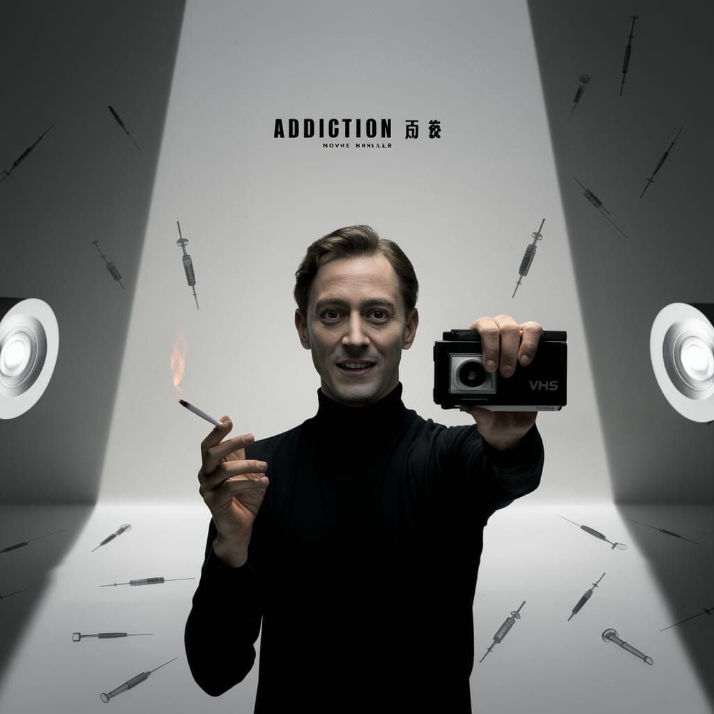 A stark movie poster depicting a man with a disturbing smile holding a camera. Faint syringe outlines litter the background, enhancing the psychological thriller aesthetic through high-contrast lighting.