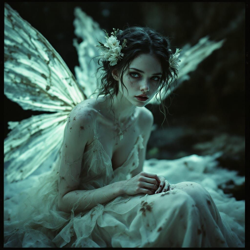 A cinematic film still of a beautiful fairy with a vacant, uninterested look. Her skin and wings appear to be melting and fading, conveying melancholy and decay.