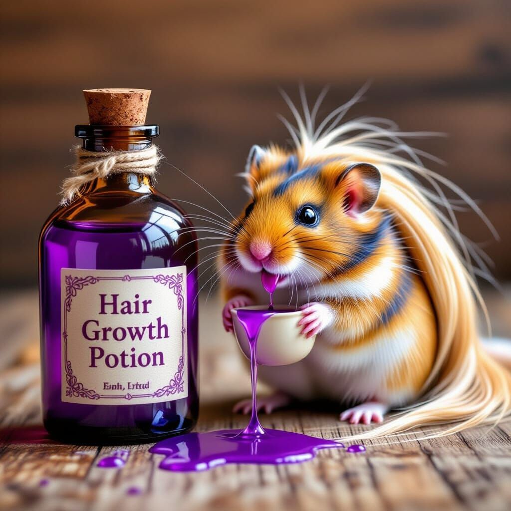 This image shows a hamster with rapidly growing fur after ingesting a glowing purple potion. The scene captures the moment of dramatic hair elongation.