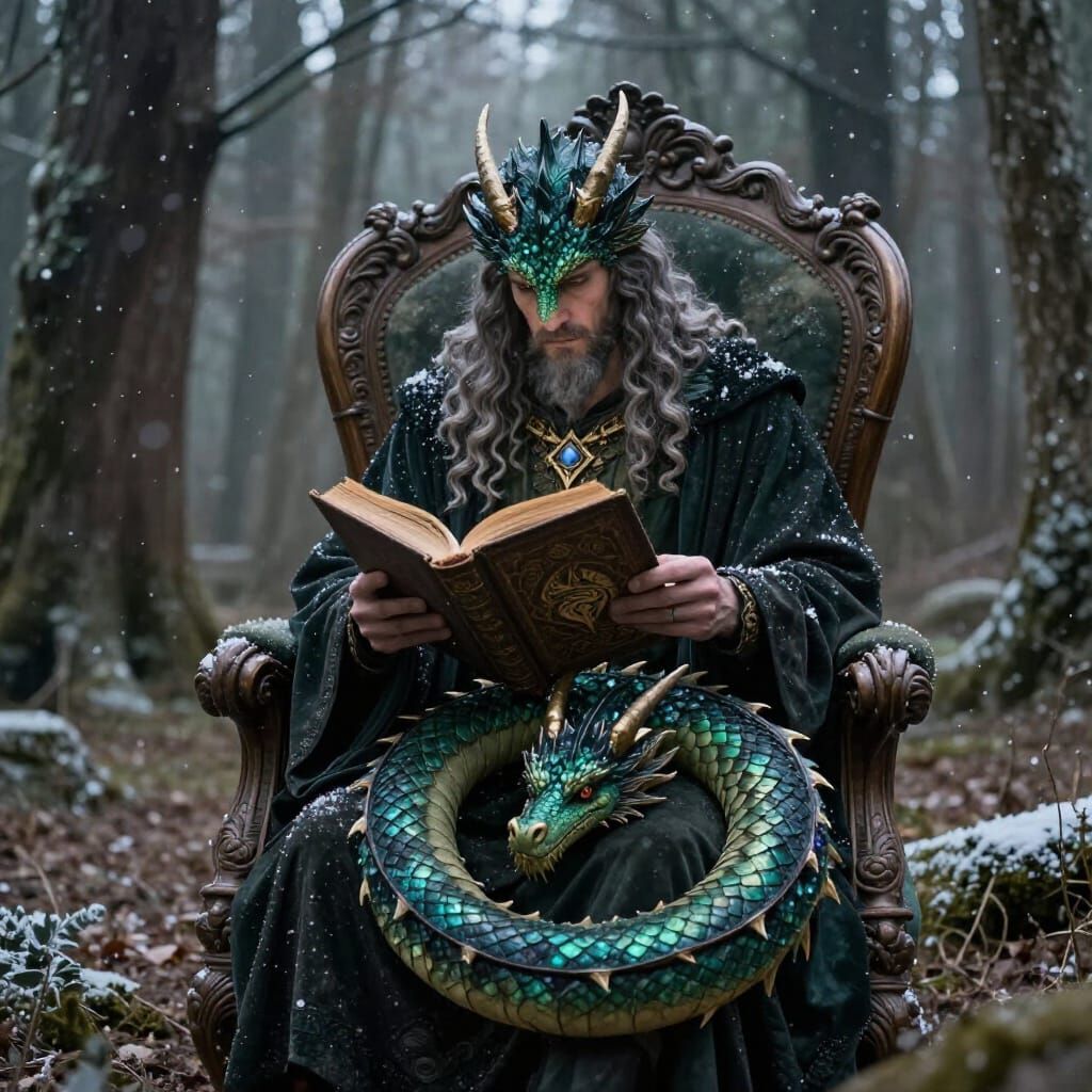 A magical scene unfolds as a wizard reads an arcane book to a gem dragon nestled on his lap. Snow begins to fall gently in the enchanted forest.