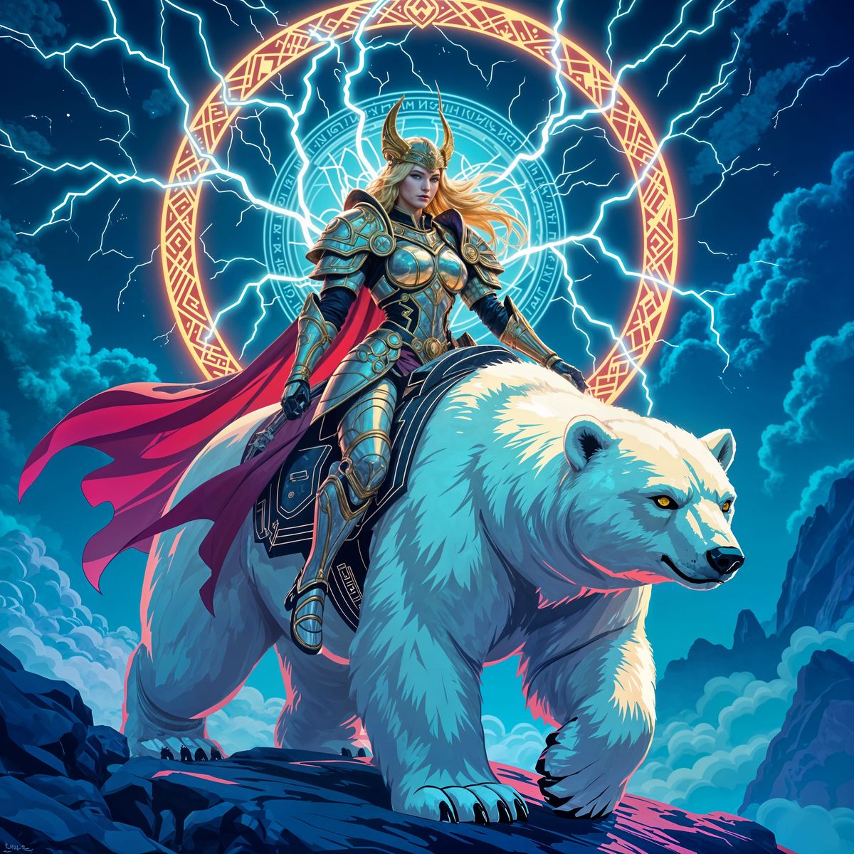 A digital painting depicting a cybernetic valkyrie riding a robotic polar bear through a neon afterlife. Lightning illuminates the scene, rendered with intricate mechanical details in mixed media comic book art.