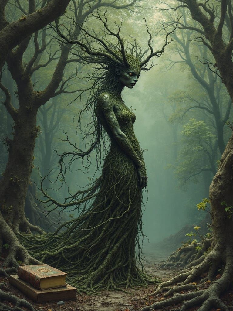 A haunting image of a female tree demon in a mystical forest. The scene features twisting vines, ancient tomes, and strange artifacts, rendered with intricate details and volumetric lighting in a dark fantasy style.