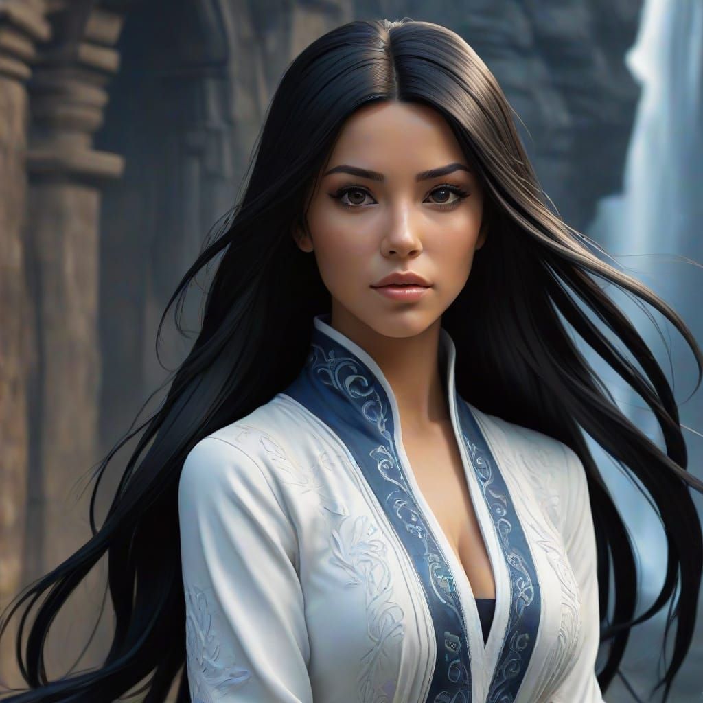 This image depicts a young nun monk warrior with a toned body, long black hair, and deep eyes, wearing a soft white habit with intricate patterns. The illustration style is vibrant and expressive, with bold brushstrokes and dramatic chiaroscuro lighting.