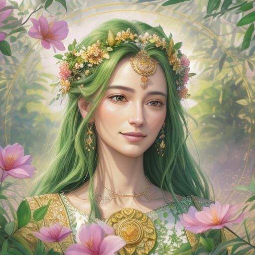 This image shows a close-up portrait of a goddess surrounded by lush greenery and vibrant flowers, with intricate patterns on her robes and a gentle smile. Created in a hyper-realistic digital art style with soft brushstrokes and realistic textures.