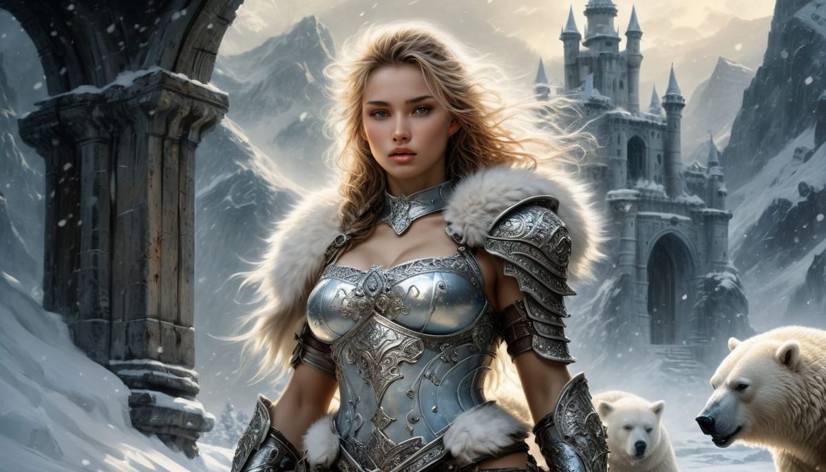 A striking picture of a beautiful woman warrior with sword and armored polar bears before an ice castle. The artwork features intricate armor details and a wintry, cinematic atmosphere reminiscent of fantasy realism.