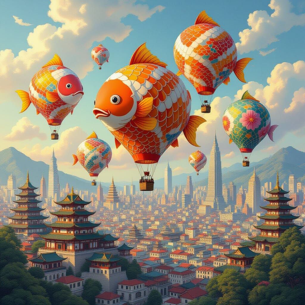 A scene shows koi fish-shaped hot air balloons drifting over a diverse cityscape. This dreamlike picture features soft colors and intricate details, reminiscent of surrealist painting.