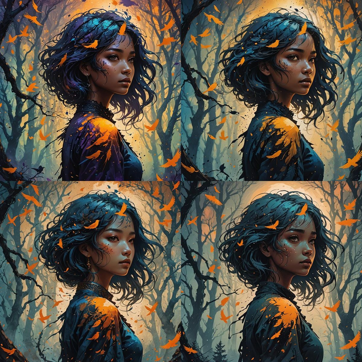 A striking picture of a girl's silhouette formed from splattered bird-shaped ink. This detailed matte painting features deep colors and intricate details in a fantasy concept art style.
