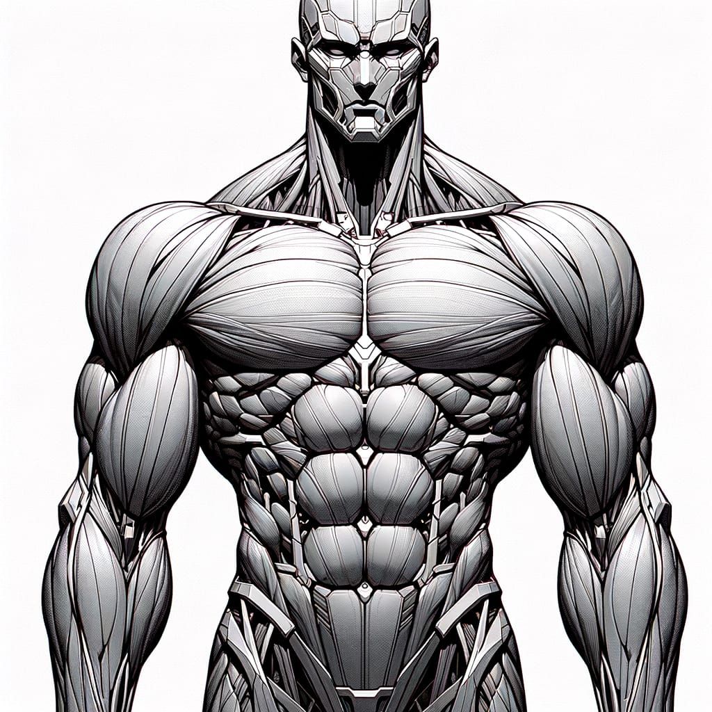 This anime-inspired image depicts a strong and muscular warrior with an elegant aesthetic, standing tall with an air of strength and determination. His body is well-defined, with prominent muscles, and he wears stylized armor with intricate details and a distinctive helmet design.