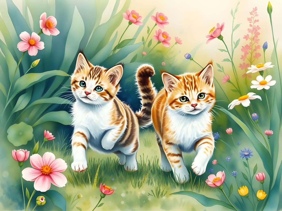 Bring your favorite feline friends to life with our free AI image generator. Easily create custom watercolor paintings of cats in a variety of playful scenes.